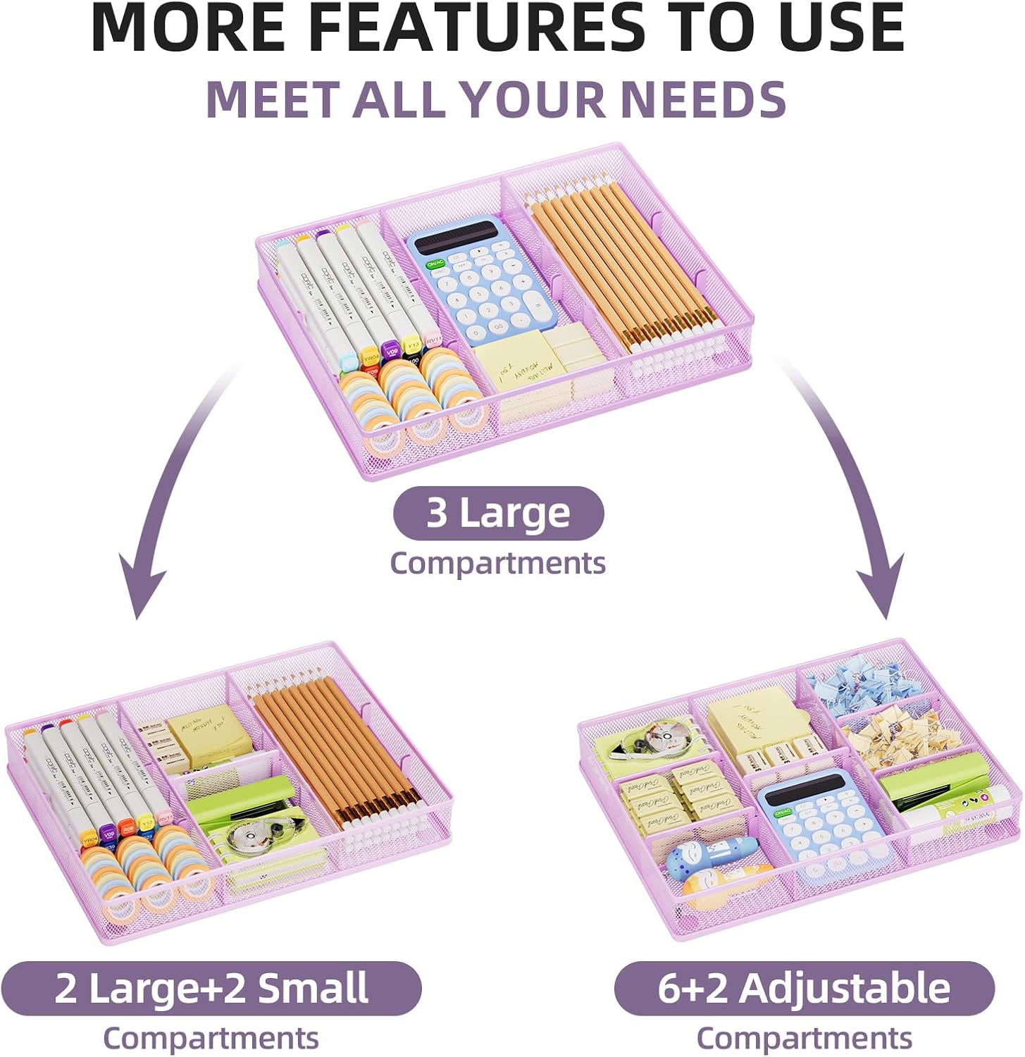 Marbrasse Desk Drawer Organizer, Metal Mesh Drawer Organizer Tray with 5 Adjustable Compartments,Desk Organizers and Accessories for Home,Office,Kitchen,Makeup,Vanity (Purple)