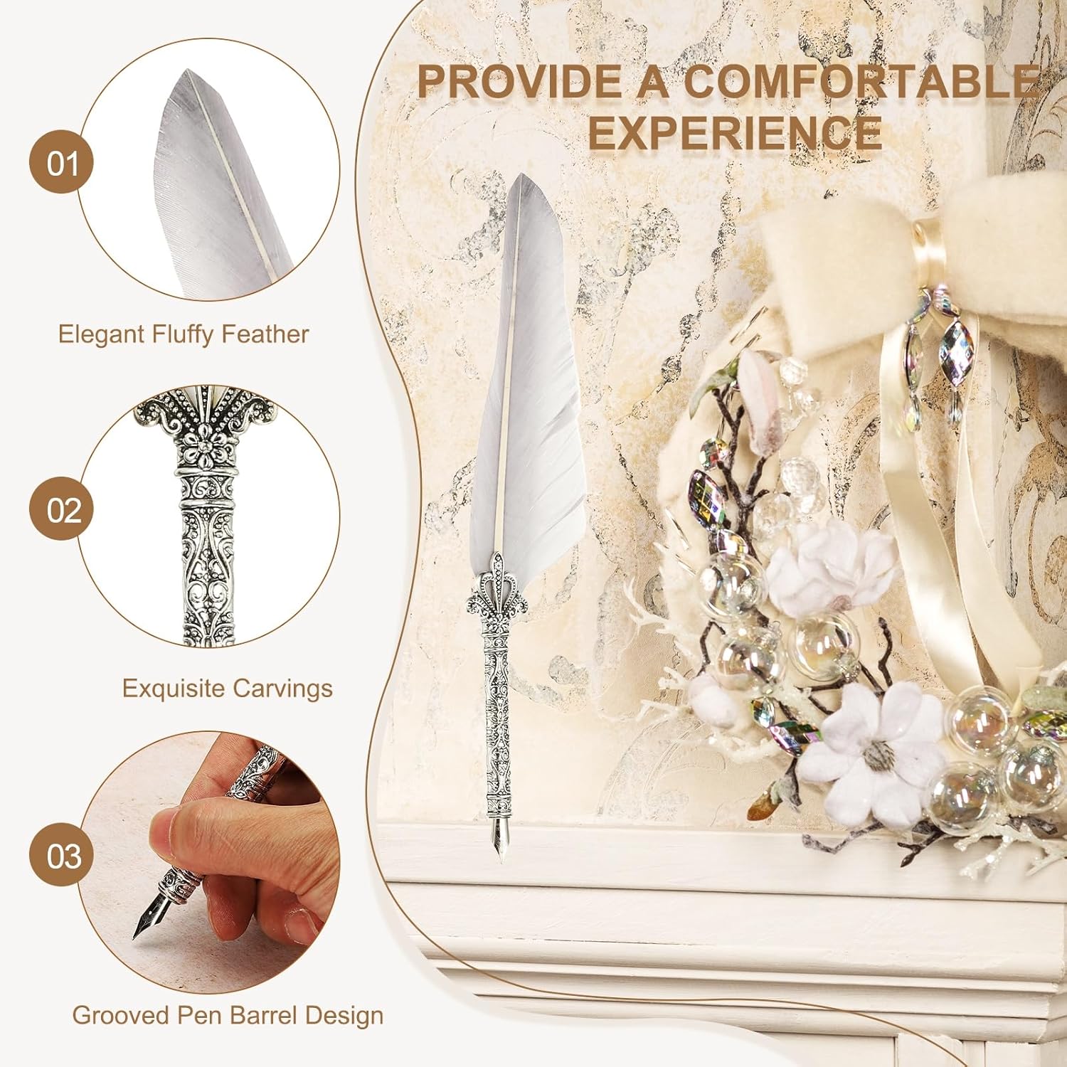 - This feather pen is widely used in weddings, parties, birthdays, invitations, anniversaries, offices, homes, etc. It can be used as an office supply or stationery for you to write, sign, and practice calligraphy to increase the fun of life.