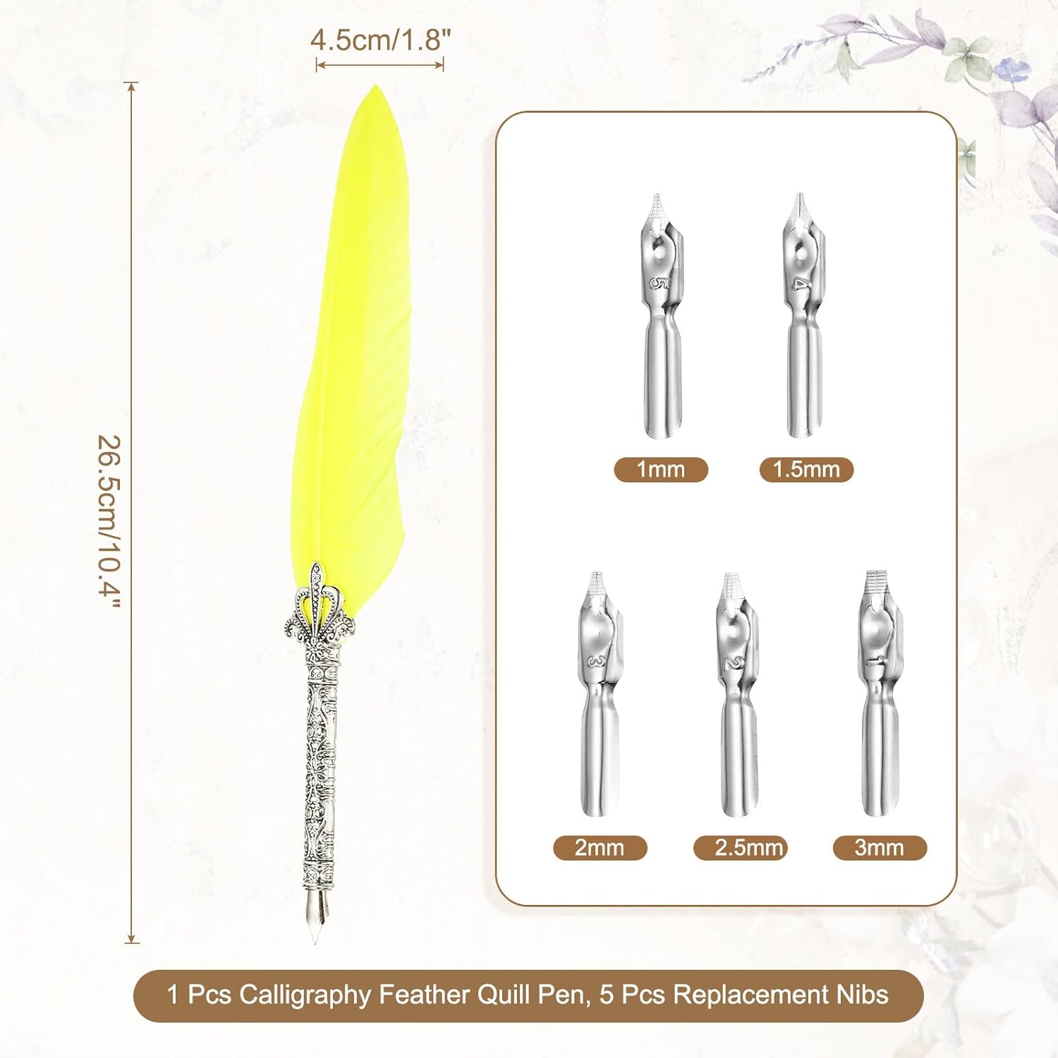 - Specifications: Color: Yellow; Material: Metal, Feather; Pen length: 26.5 x 4.5cm / 10.4 x 1.8inch ( L * W ); Pen Diameter: 0.8cm / 0.3inch; Packing List: 1 x Calligraphy Feather Quill Pen, 5 x Replacement Nibs
