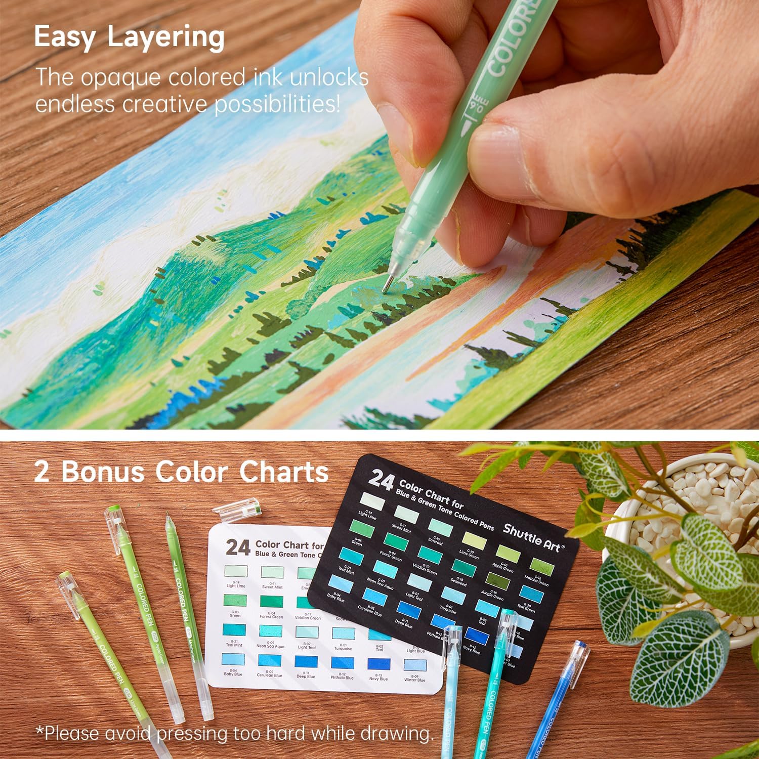 - 24 BLUE GREEN TONE COLORS & 2 COLOR SHEETS: Shuttle Art colored pen set comes with 24 blue & green tone colors. Varied and vivid colors look stunning on paper, especially standing out on black paper. Additionally, it contains 2 bonus color sheets. A hassle-free choice for your creating.