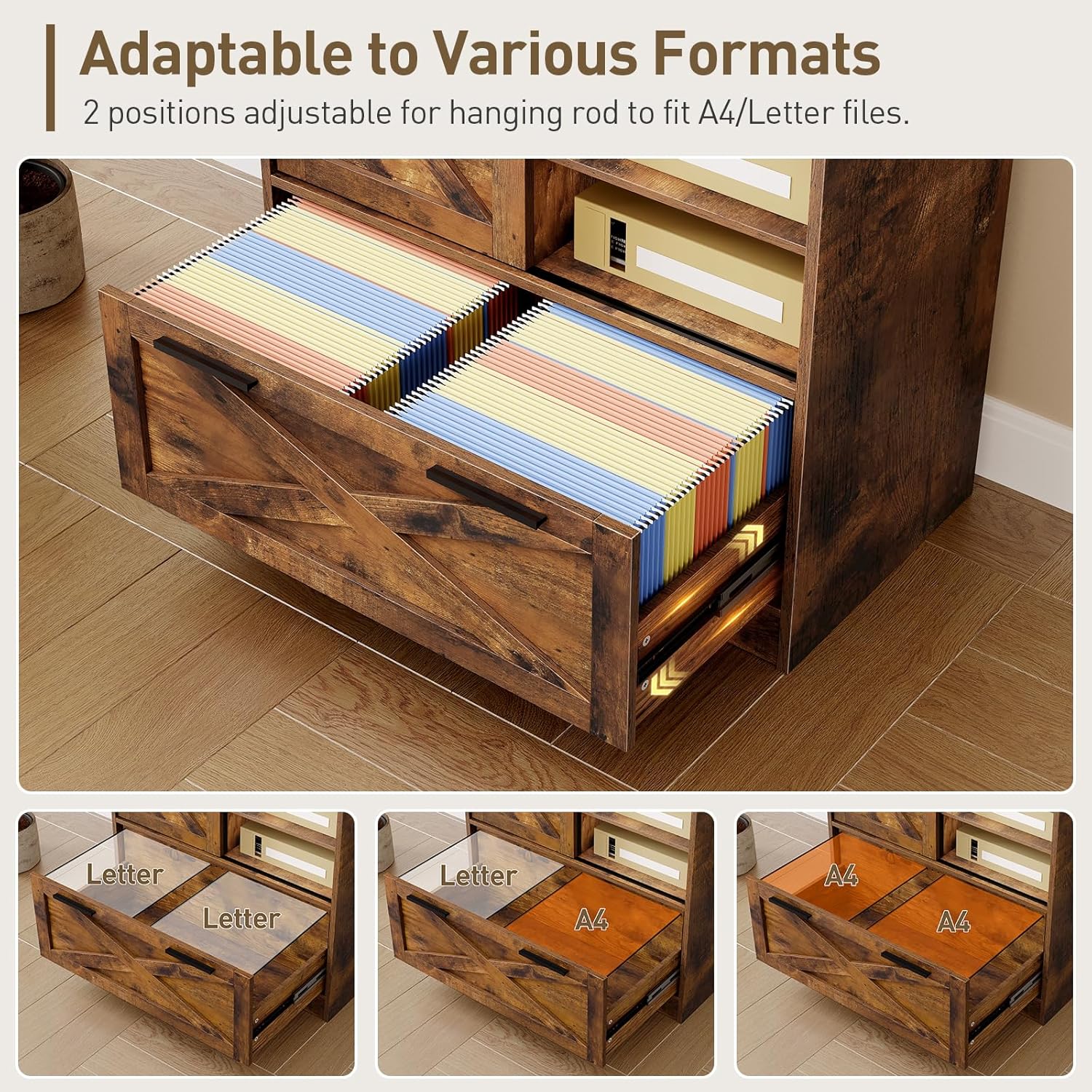 File Cabinet with Charging Station, Vertical Filing Cabinet with Shelves, File Cabinet for Home Office, Printer Stand with Storage Shelves & Barn Doors, Fits A4/Letter Files, Rustic