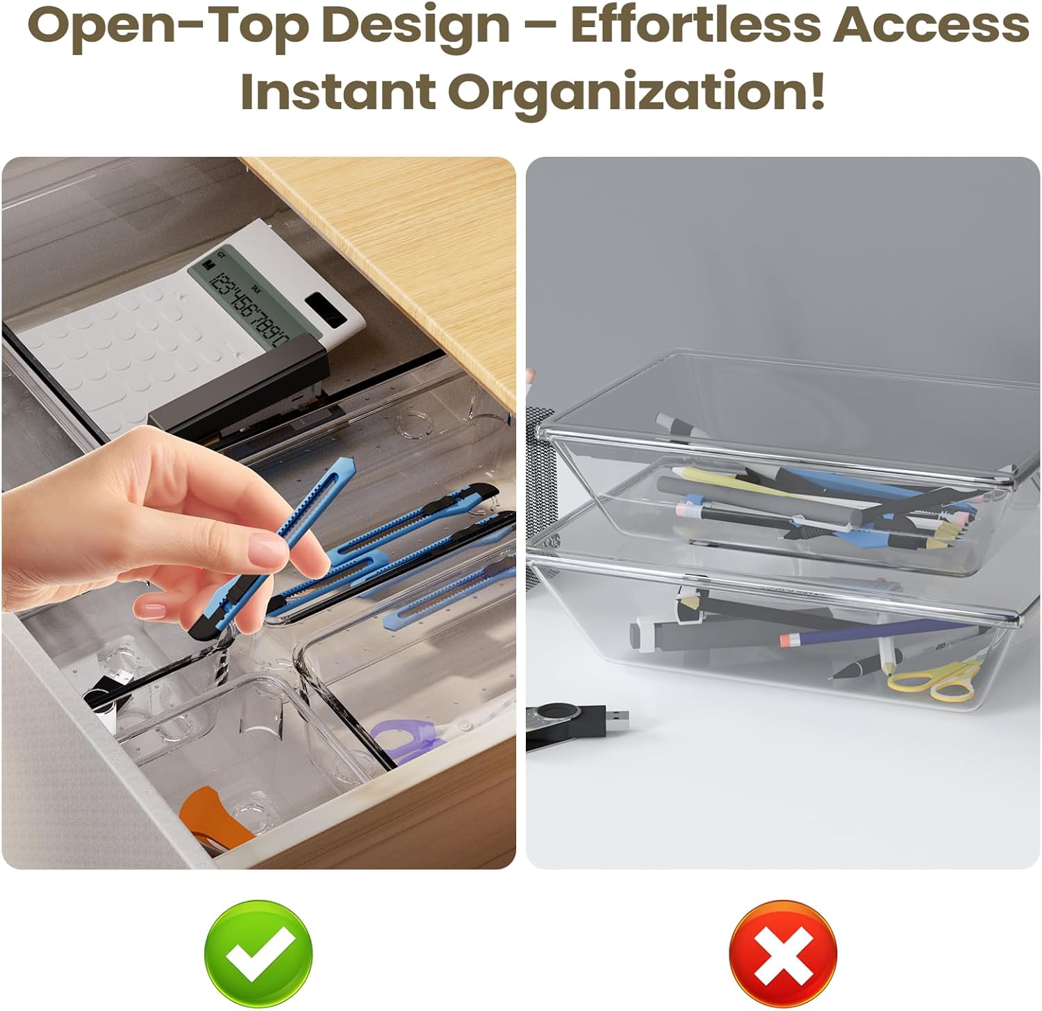 6 PCS Clear Plastic Drawer Organizer Set, 2 Sizes Acrylic Drawer Storage Trays Non Slip Storage Bins for Makeup, Jewelry, Gadgets for Kitchen, Bedroom, Bathroom, Office
