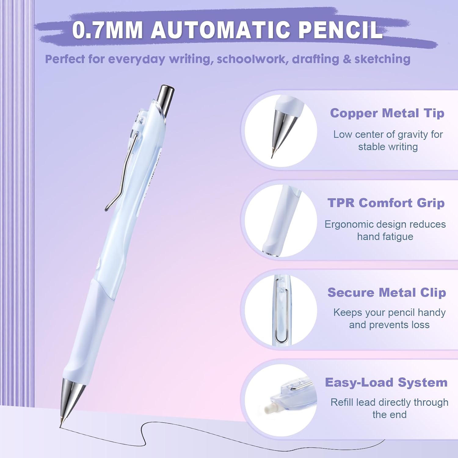 6-Pack 0.7mm Mechanical Pencils with Macaron Colors, Built-In Eraser, Copper Tip, Easy-Load Lead, Metal Clip, Soft Grip, for School, Office, Sketching, Drafting