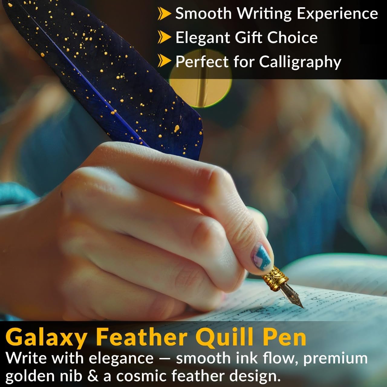 - COMPLETE SET: Luxurious calligraphy kit includes vintage-style dip pen, multiple ornate pen holders, decorative feather quill, and 6 bottles of colored ink in an elegant gift box