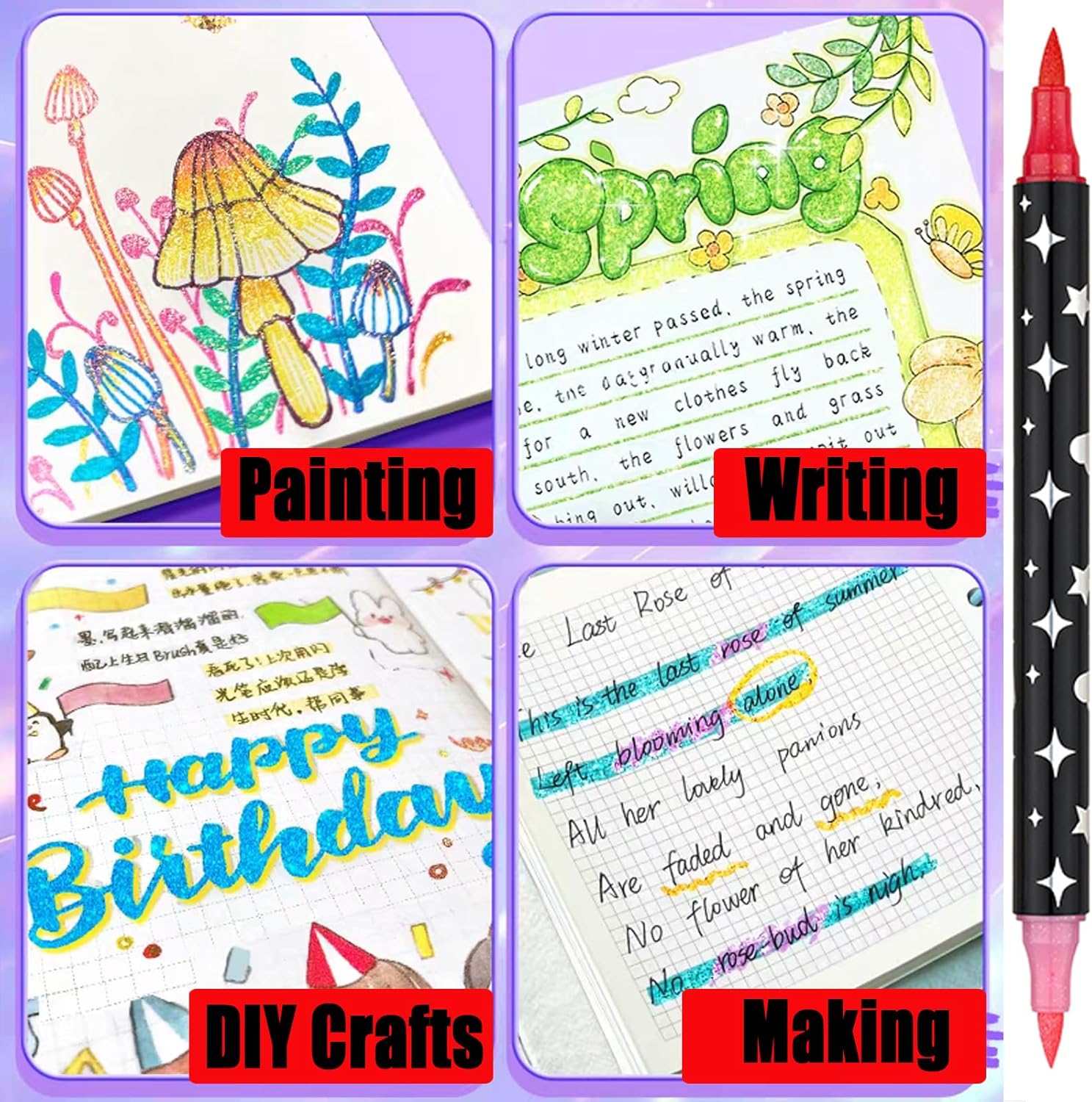 - Dual Tip Design:Dual tip glitter brush markers with two different flash colors,this design is perfect sparkle effect. The soft tip controls the thickness of the strokes,can accurately control the thickness,strength and direction of strokes. Whether it's writing,painting,or marking with a highlighter,you can have a great experience that enhances the quality of your creation.