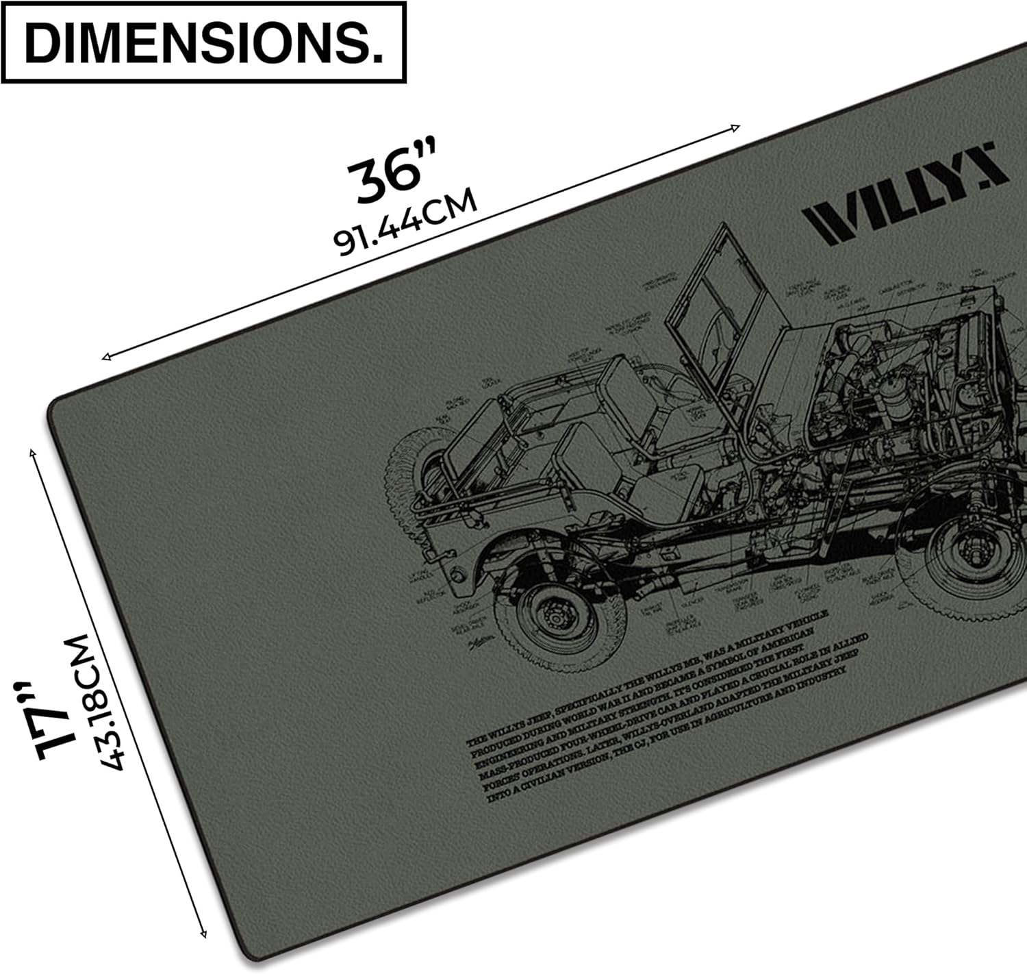 MPCO. Blueprints Large Gaming Desk Pad - 36" x 17" Aeroglyde Fabric Willys Jeep – Green Desk Mats - Non-Slip, Washable, Smooth Glide for Precision Gaming & Work