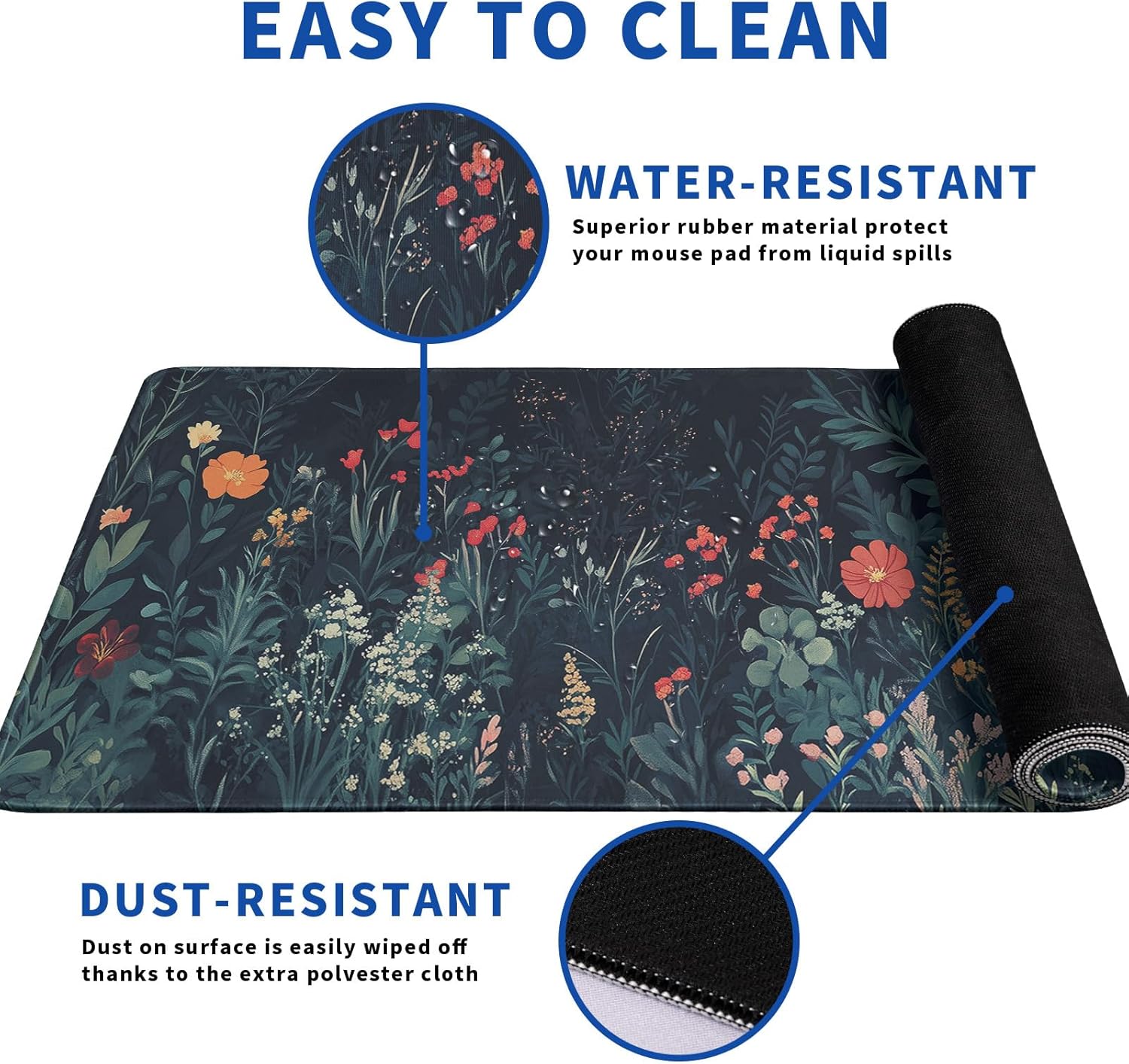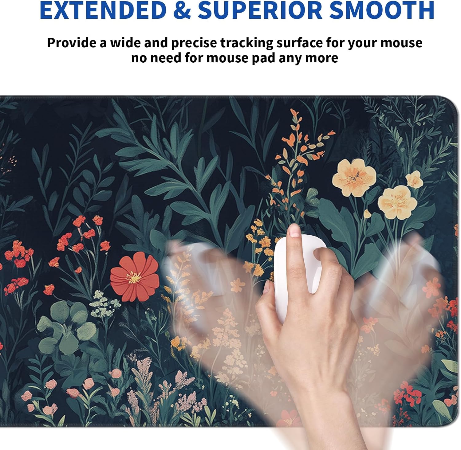- ā„[Large and Perfect Size]:The extended Flower desk pad measures 31.5x11.8x0.12 inches that covers most of the desk.The desk pad is large enough to have a mouse, gaming keyboard, and other desk items while maintaining protecting your desk all the time.You can freely move your mouse without any interruption and don't have to continually adjust the mat as you do with traditional mousepads.