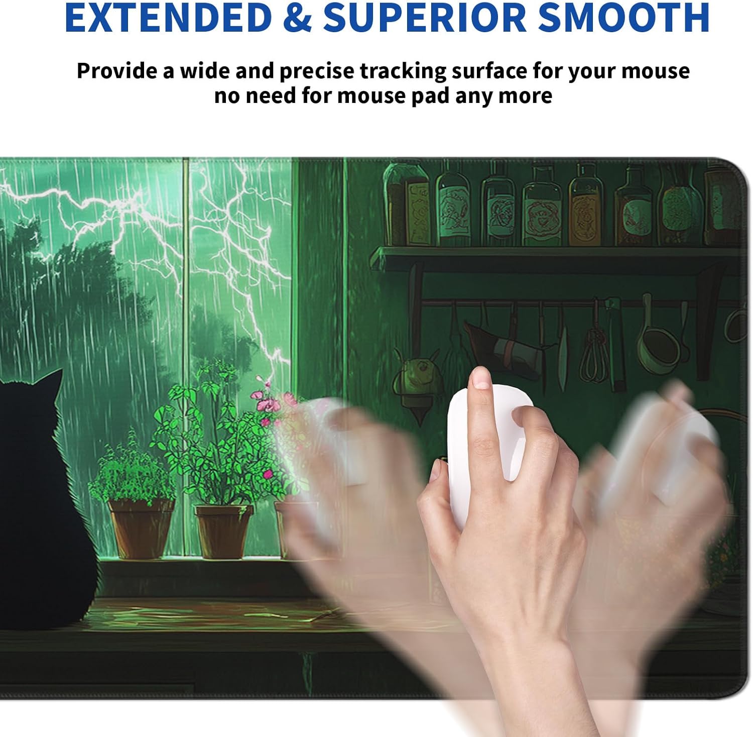 - ā„[Large and Perfect Size]:The extended Green Black Cat desk pad measures 31.5x11.8x0.12 inches that covers most of the desk.The desk pad is large enough to have a mouse, gaming keyboard, and other desk items while maintaining protecting your desk all the time.You can freely move your mouse without any interruption and don't have to continually adjust the mat as you do with traditional mousepads.