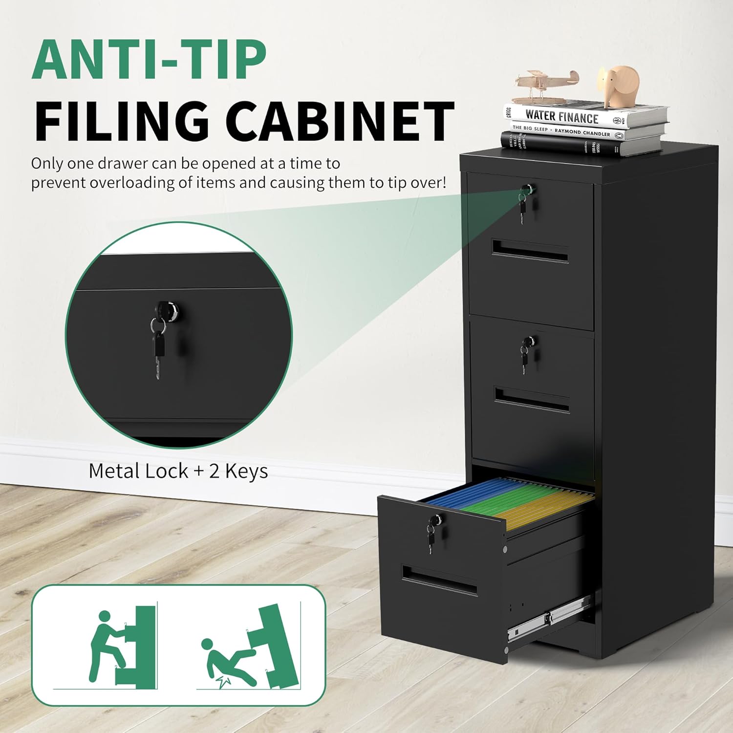 File Cabinet 3 Drawer with Lock, Vertical Filing Cabinets for Home Office, Metal Steel Storage Cabinet for Letter/Legal Size File, Assembly Required(Black)