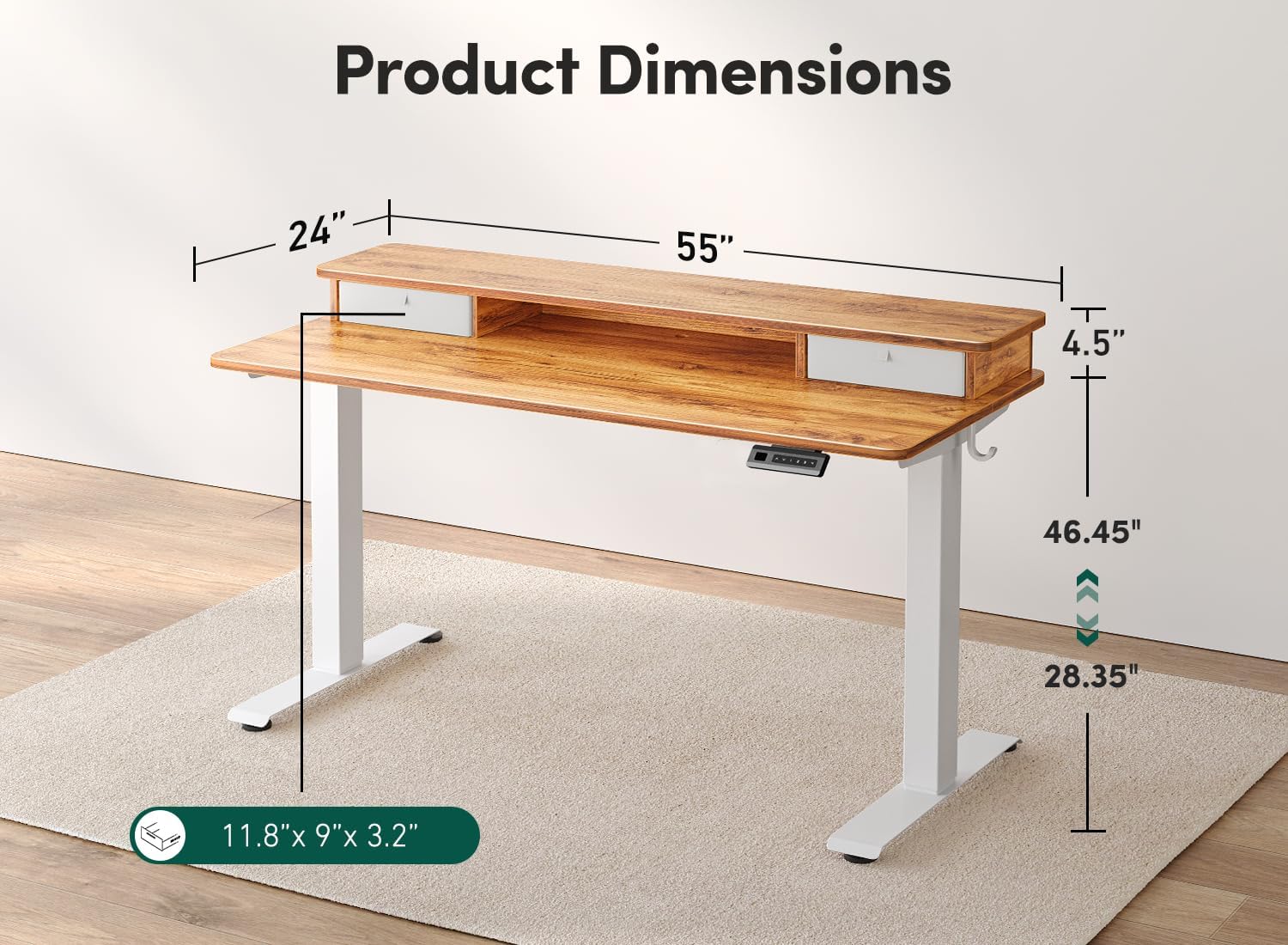 FEZIBO 55 x 24 Inch Height Adjustable Electric Standing Desk with Double Drawer, Computer Desk, Home Office Stand Up Table with 4 Height-Adjustable Feets & 2 Hooks, Light Rustic